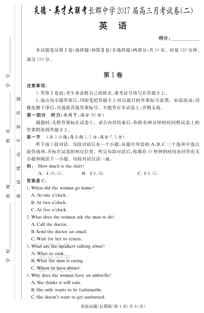 【英語】炎德英才大聯(lián)考2017長郡中學(xué)高三2次月考