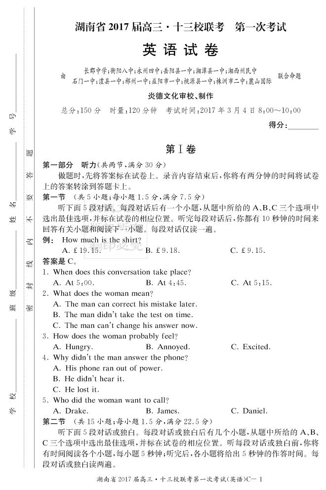 【英語】炎德英才大聯(lián)考2017長郡中學(xué)高三7次月考(十三校聯(lián)考一)