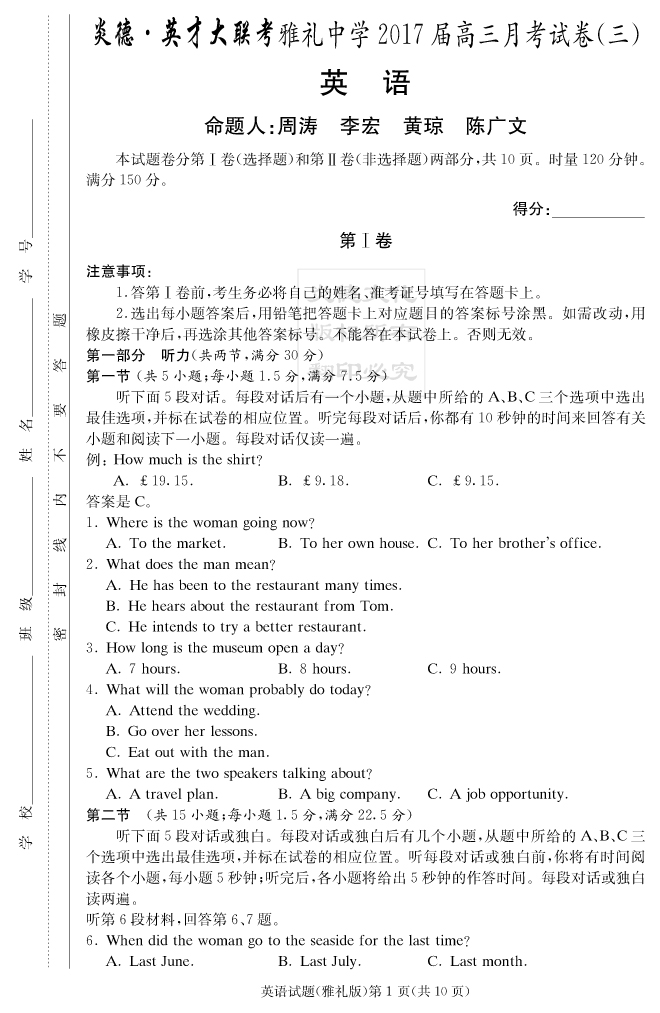 【英語】炎德英才大聯(lián)考2017雅禮中學(xué)高三3次月考