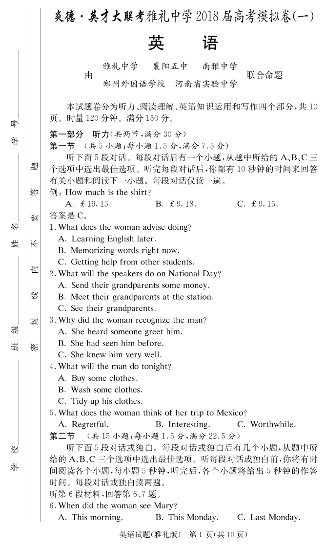【英語】炎德英才大聯(lián)考2018雅禮中學(xué)高三10次月考(模擬一)