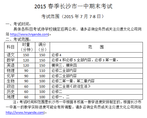 2015年春季長(zhǎng)沙市一中高一期末考試范圍(2015.07.07-08)
