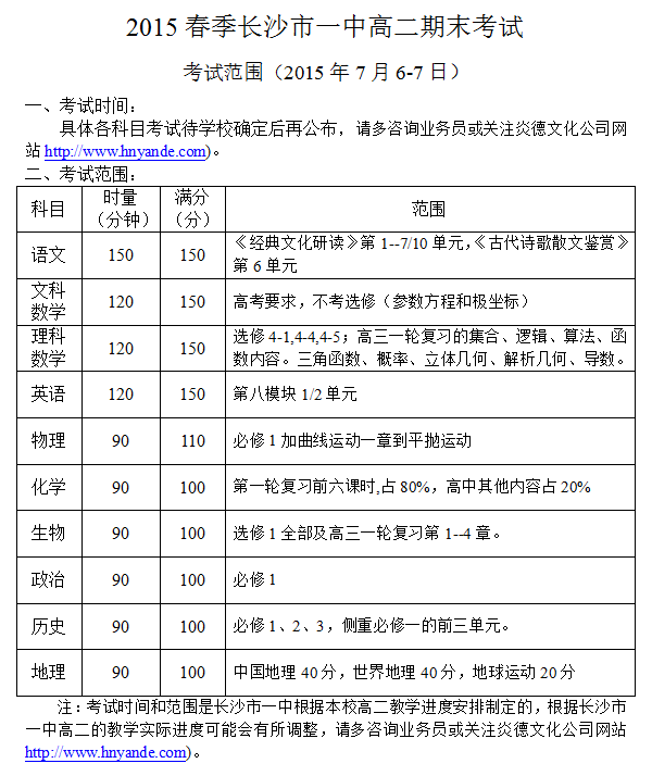 2015年春季長(zhǎng)沙市一中高二期末范圍(2015.07.06-07)