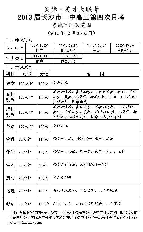炎德英才大聯(lián)考長沙市一中2013屆高三第四次月考考試時間和范圍