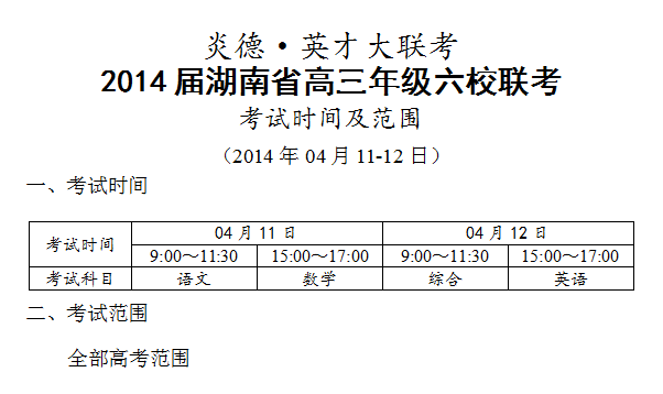 下一篇:炎德英才大聯(lián)考長沙一中2014屆高三第一次模擬(第9次月考)考試時間和范圍(2014.05.0