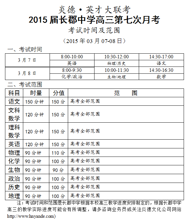 炎德英才大聯(lián)考長郡中學(xué)2015屆高三第7次月考考試時間和范圍(湖南省十三校聯(lián)考一2015.03.07-08)