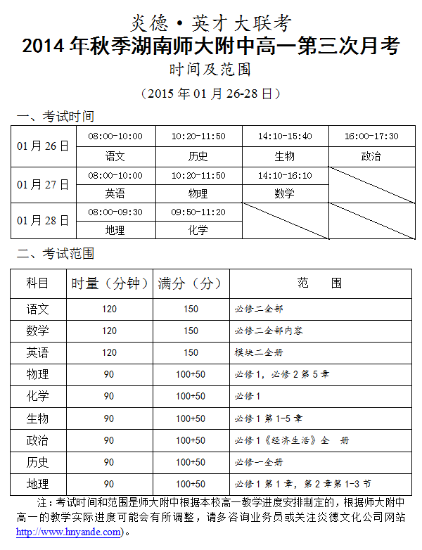 炎德英才大聯(lián)考2014年秋季湖南師大附中高一第三次月考考試時(shí)間和范圍(2014.12.27-28)