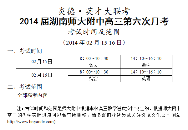 炎德英才大聯(lián)考師大附中2014屆高三第6次月考考試時(shí)間和范圍(2014.02.15-16)
