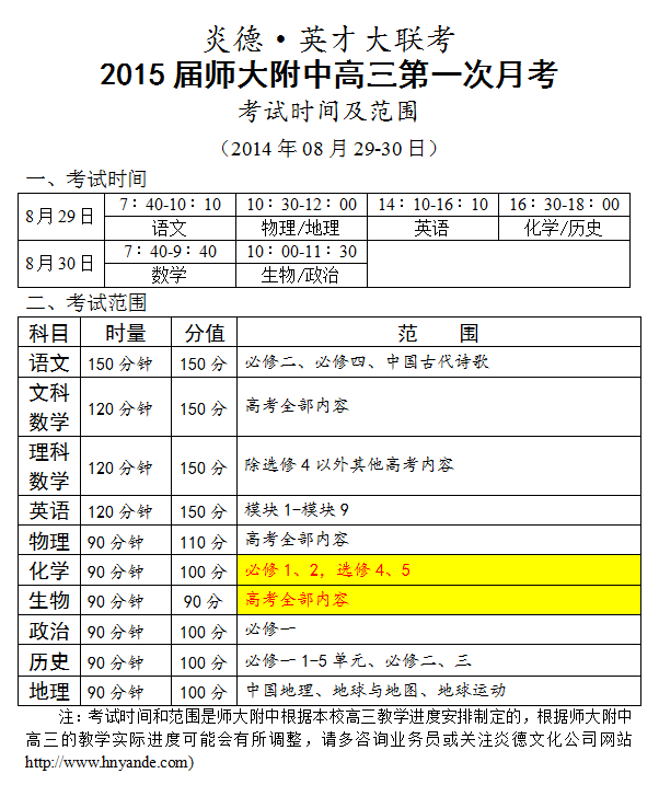 炎德英才大聯(lián)考師大附中2015屆高三第1次月考考試時(shí)間和范圍(2014.08.29-30)