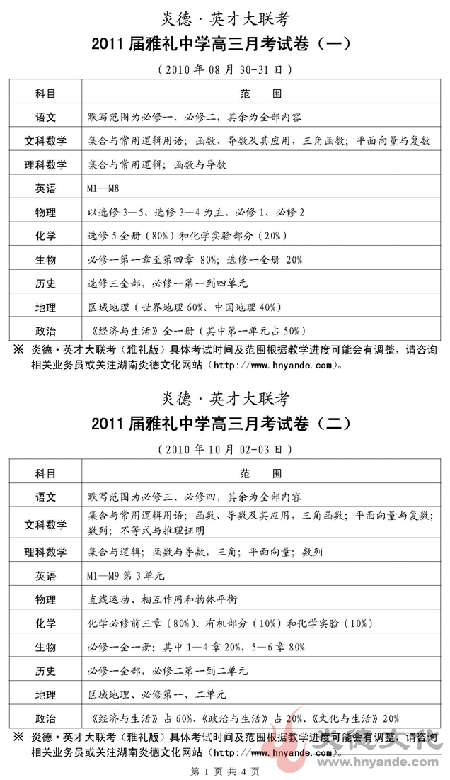 炎德英才大聯(lián)考雅禮中學(xué)2011屆高三第一次月考考試時間和范圍