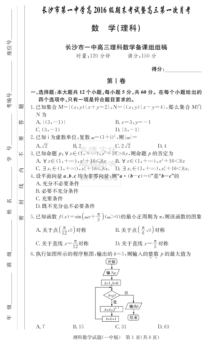 【理數(shù)】炎德英才大聯(lián)考2019長沙一中高三1次月考