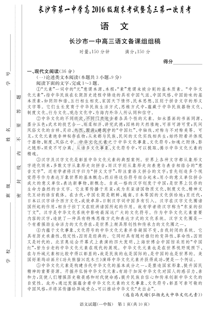 【語文】炎德英才大聯(lián)考2019長沙一中高三1次月考