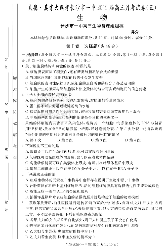 【生物】炎德英才大聯(lián)考2019長沙一中高三5次月考