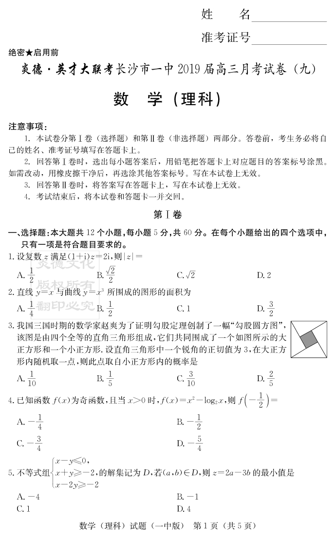 【理數(shù)】炎德英才大聯(lián)考2019長沙一中高三9次月考