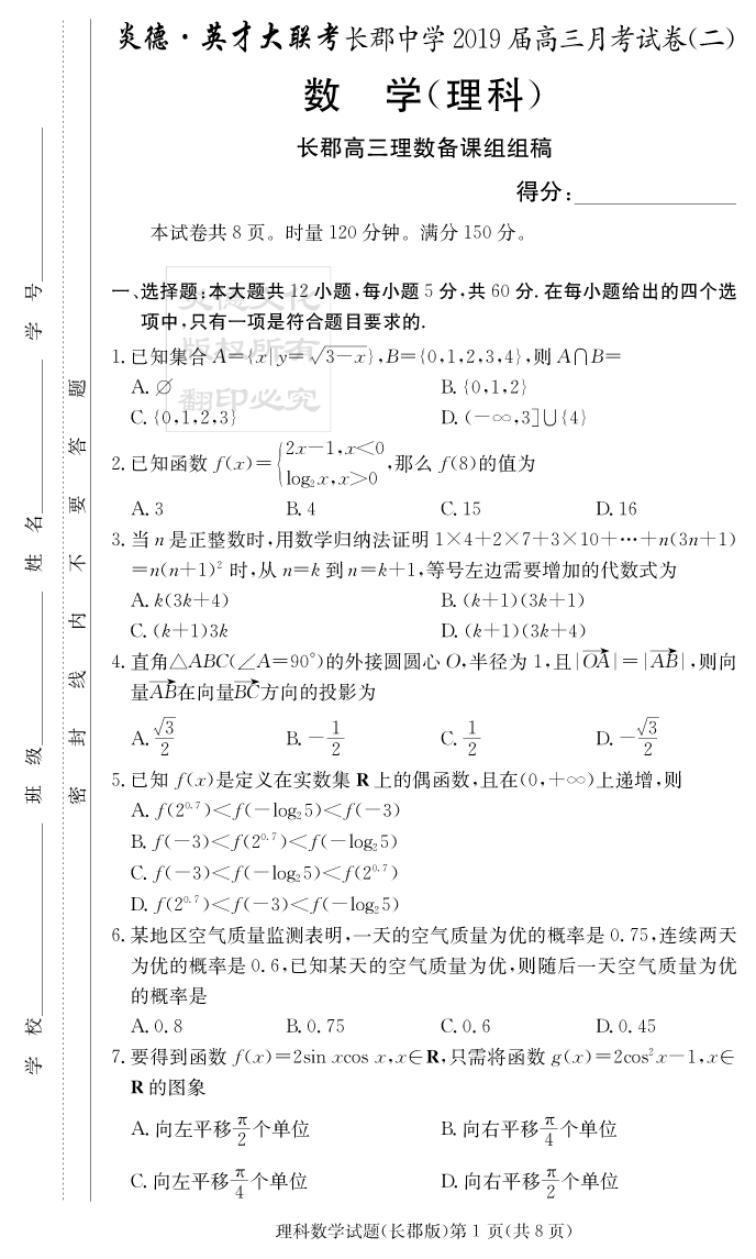 【理數(shù)】炎德英才大聯(lián)考2019長(zhǎng)郡中學(xué)高三2次月考