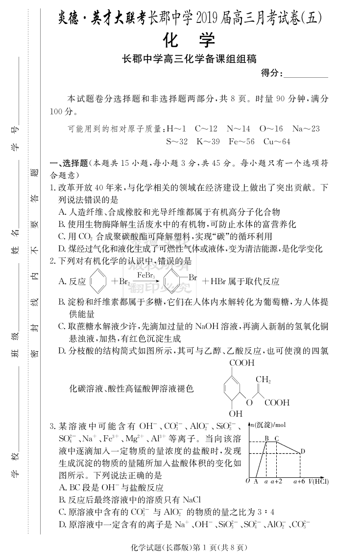 【化學(xué)】炎德英才大聯(lián)考2019長郡中學(xué)高三5次月考