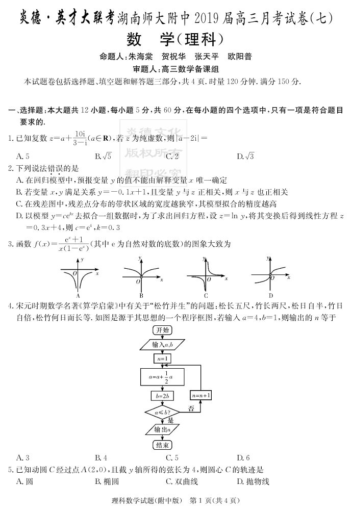 【理數(shù)】炎德英才大聯(lián)考2019師大附中高三7次月考
