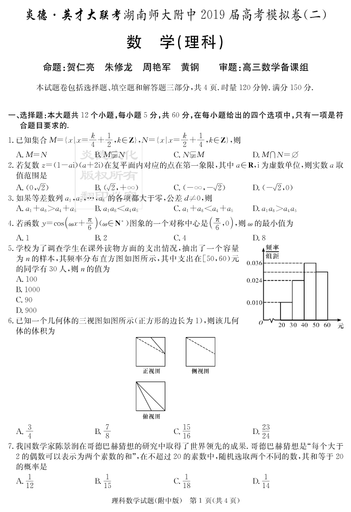 【理數(shù)】炎德英才大聯(lián)考2019師大附中高三9次月考(模擬二)