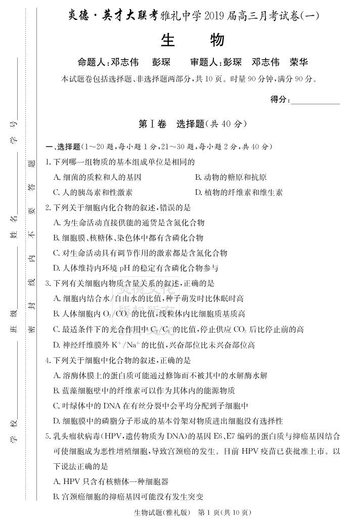 【生物】炎德英才大聯(lián)考2019雅禮中學(xué)高三1次月考