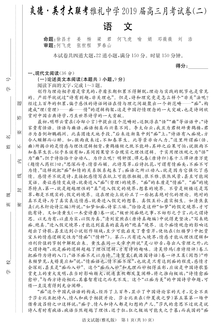 【語文】炎德英才大聯(lián)考2019雅禮中學(xué)高三2次月考