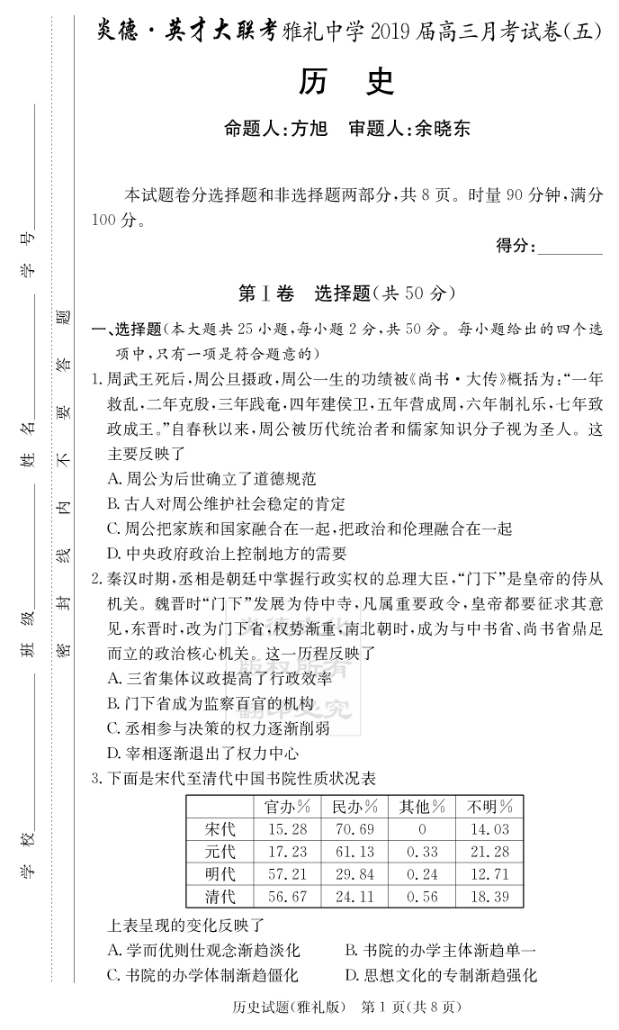 【歷史】炎德英才大聯(lián)考2019雅禮中學(xué)高三5次月考
