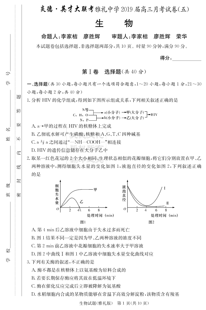 【生物】炎德英才大聯(lián)考2019雅禮中學(xué)高三5次月考