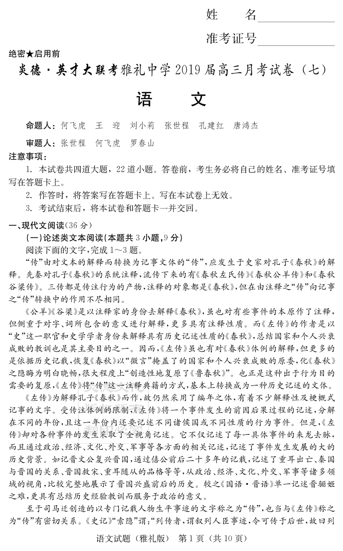 【語(yǔ)文】炎德英才大聯(lián)考2019雅禮中學(xué)高三7次月考