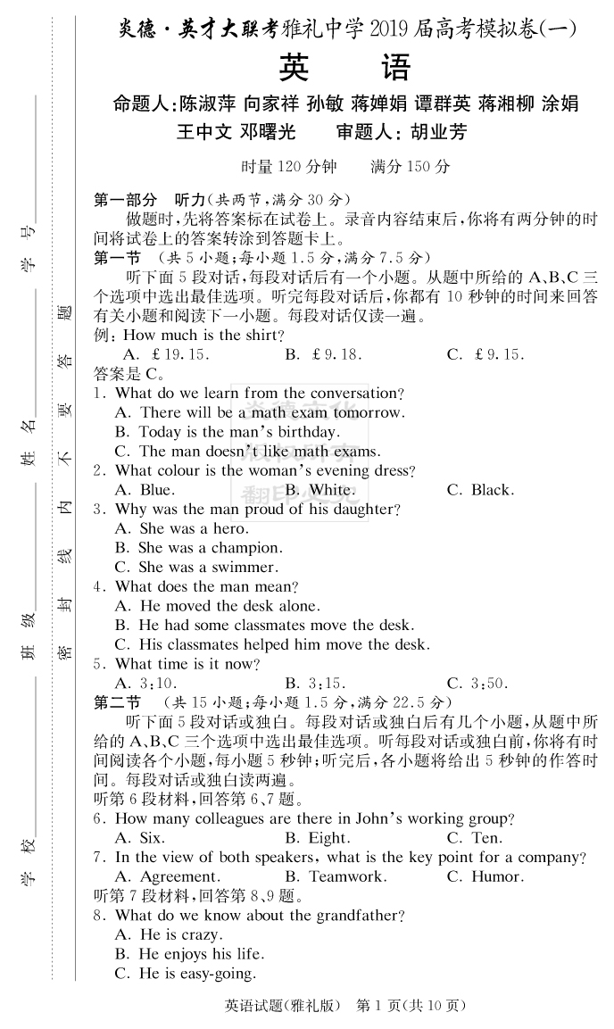 【英語(yǔ)】炎德英才大聯(lián)考2019雅禮中學(xué)高三9次月考(模擬一)