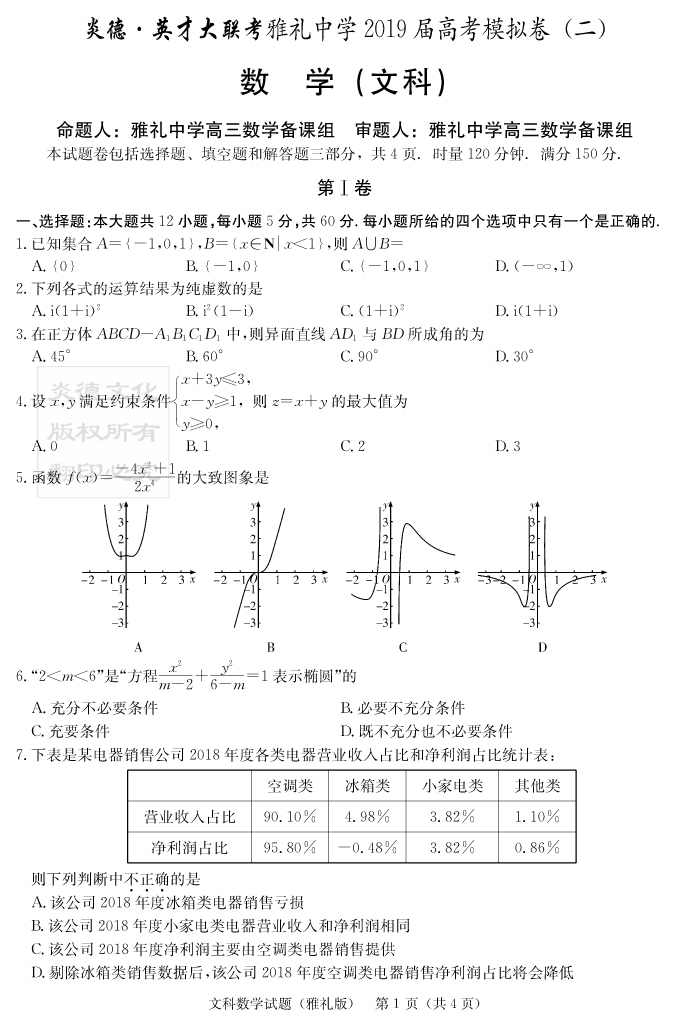 【文數(shù)】炎德英才大聯(lián)考2019雅禮中學(xué)高三10次月考(模擬二)