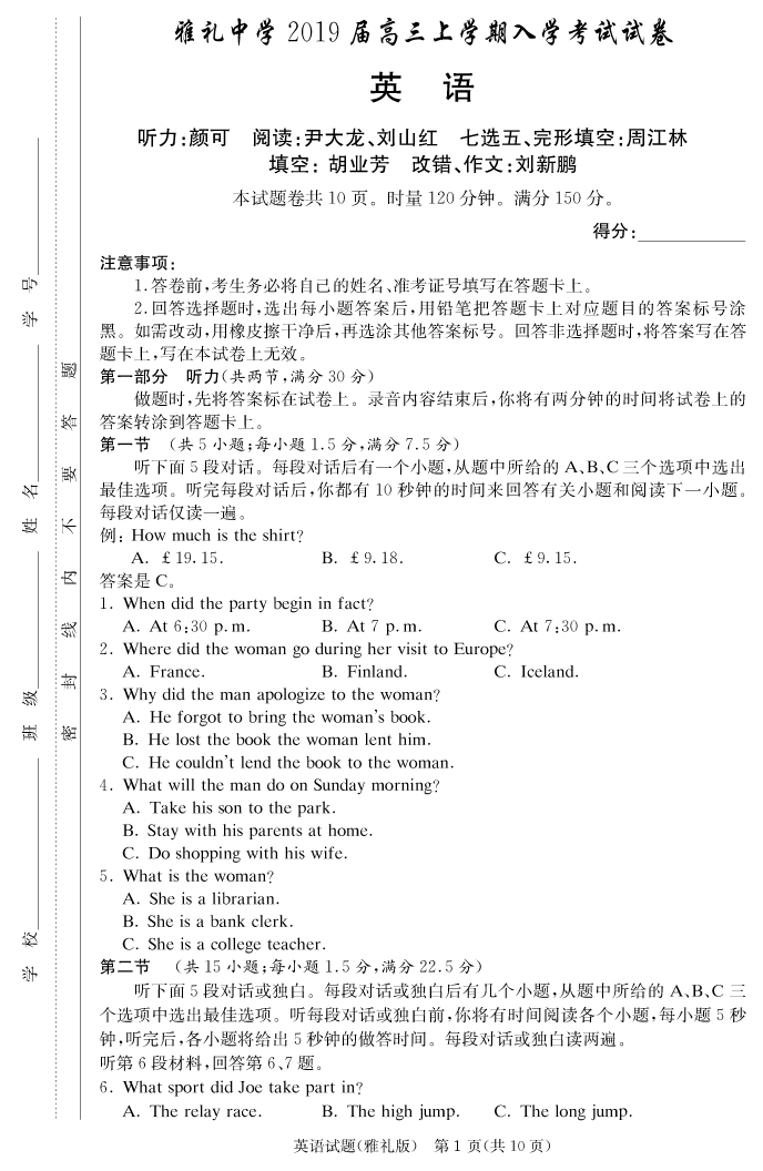 【英語(yǔ)】雅禮中學(xué)2019屆高三上學(xué)期入學(xué)考試
