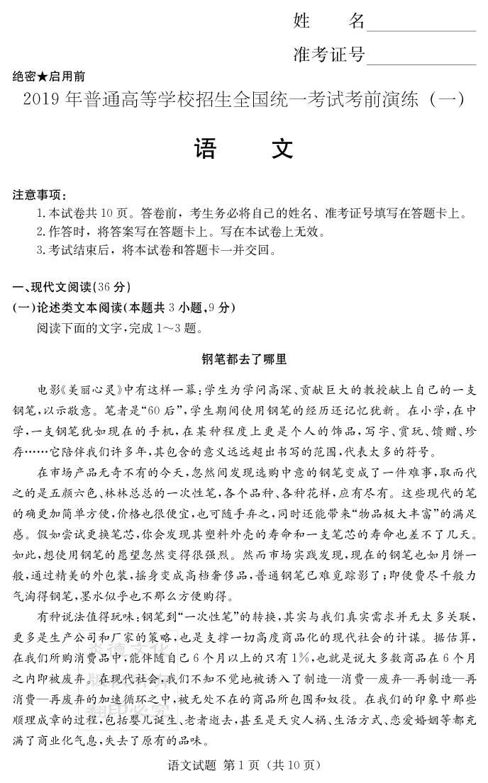 【語文】2019年普通高等學(xué)校招生全國統(tǒng)一考試考前演練(一)