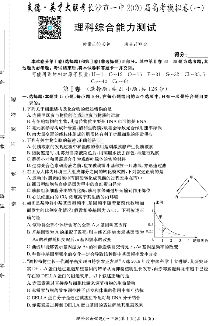 【理綜】炎德英才大聯(lián)考2020屆長沙市一中高三9次月考(模擬一)