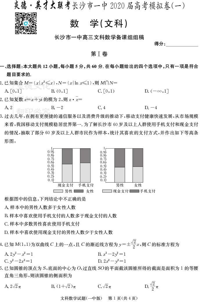 【文數(shù)】炎德英才大聯(lián)考2020屆長沙市一中高三9次月考(模擬一)