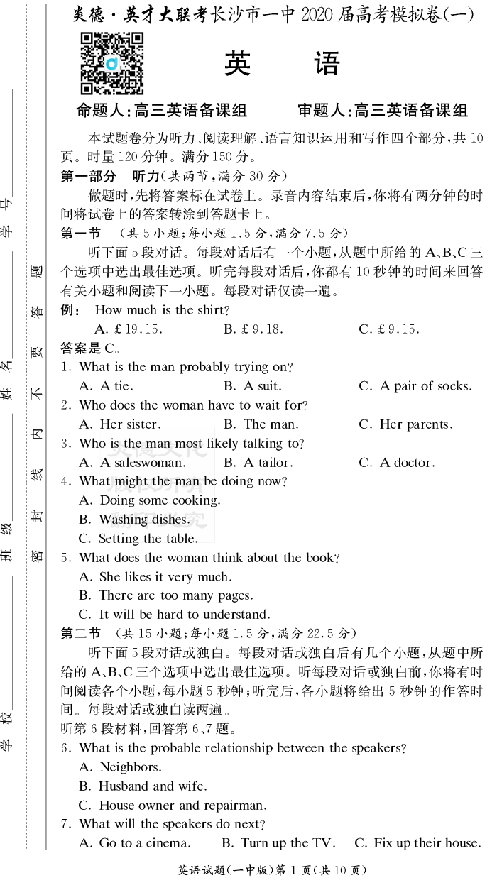 【英語】炎德英才大聯(lián)考2020屆長沙市一中高三9次月考(模擬一)