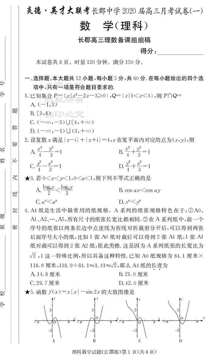 【理數(shù)】炎德英才大聯(lián)考2020屆長郡中學(xué)高三1次月考