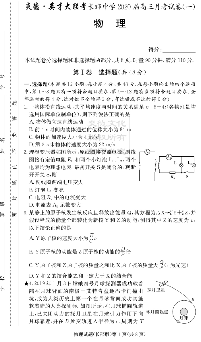 【物理】炎德英才大聯(lián)考2020屆長(zhǎng)郡中學(xué)高三1次月考