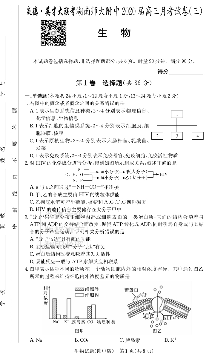 【生物】炎德英才大聯(lián)考2020屆師大附中高三3次月考
