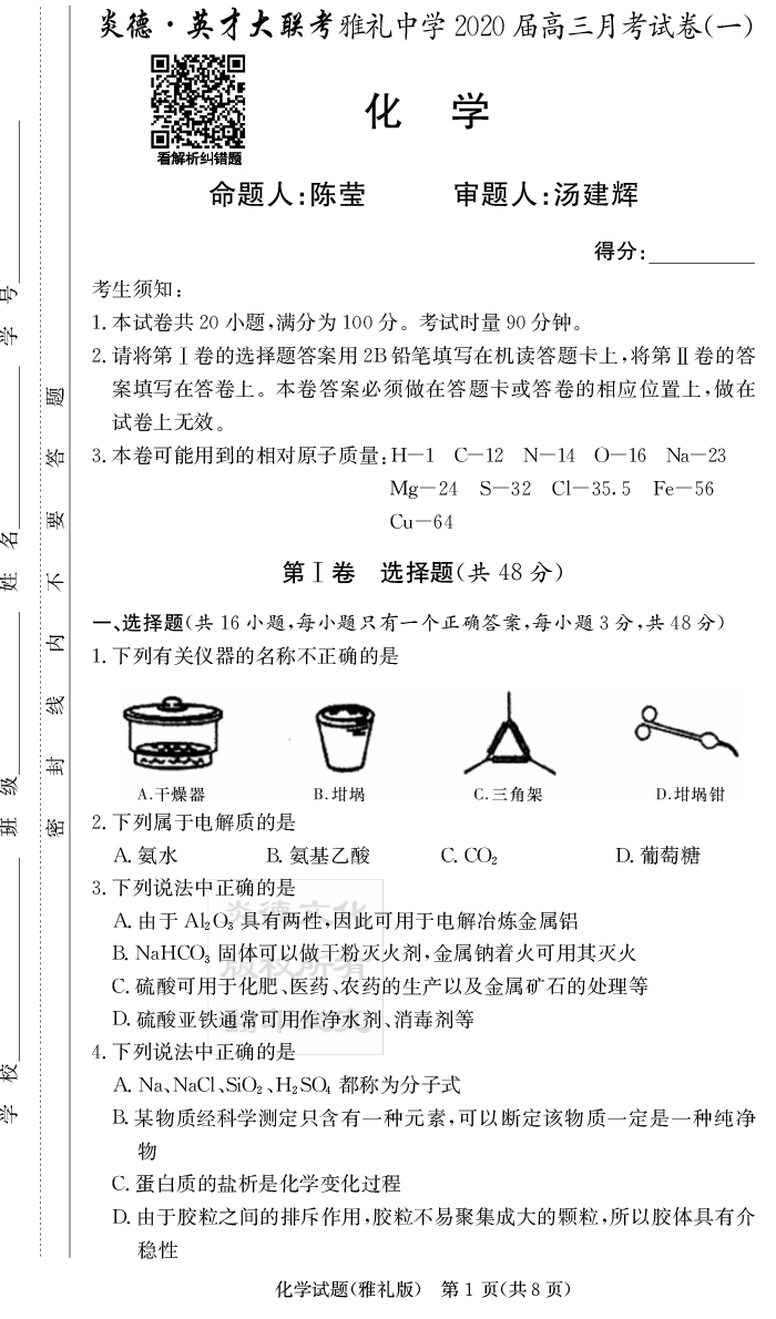 【化學(xué)】炎德英才大聯(lián)考2020屆雅禮中學(xué)高三1次月考