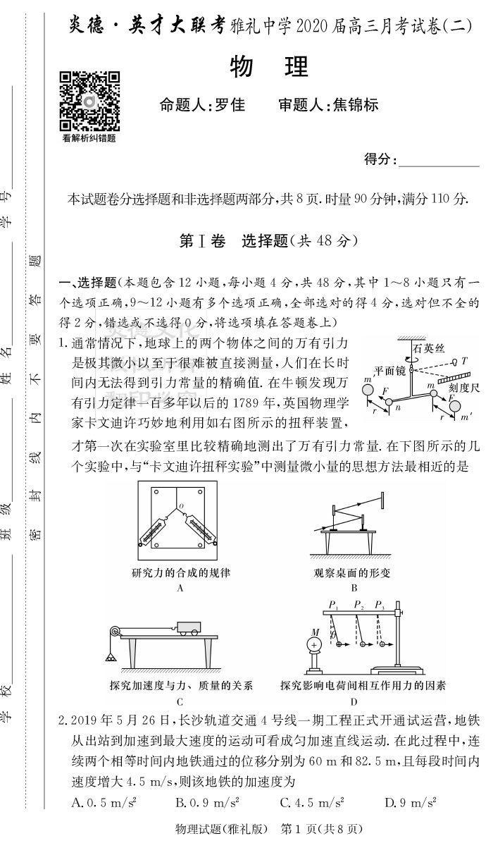 【物理】炎德英才大聯(lián)考2020屆雅禮中學(xué)高三2次月考