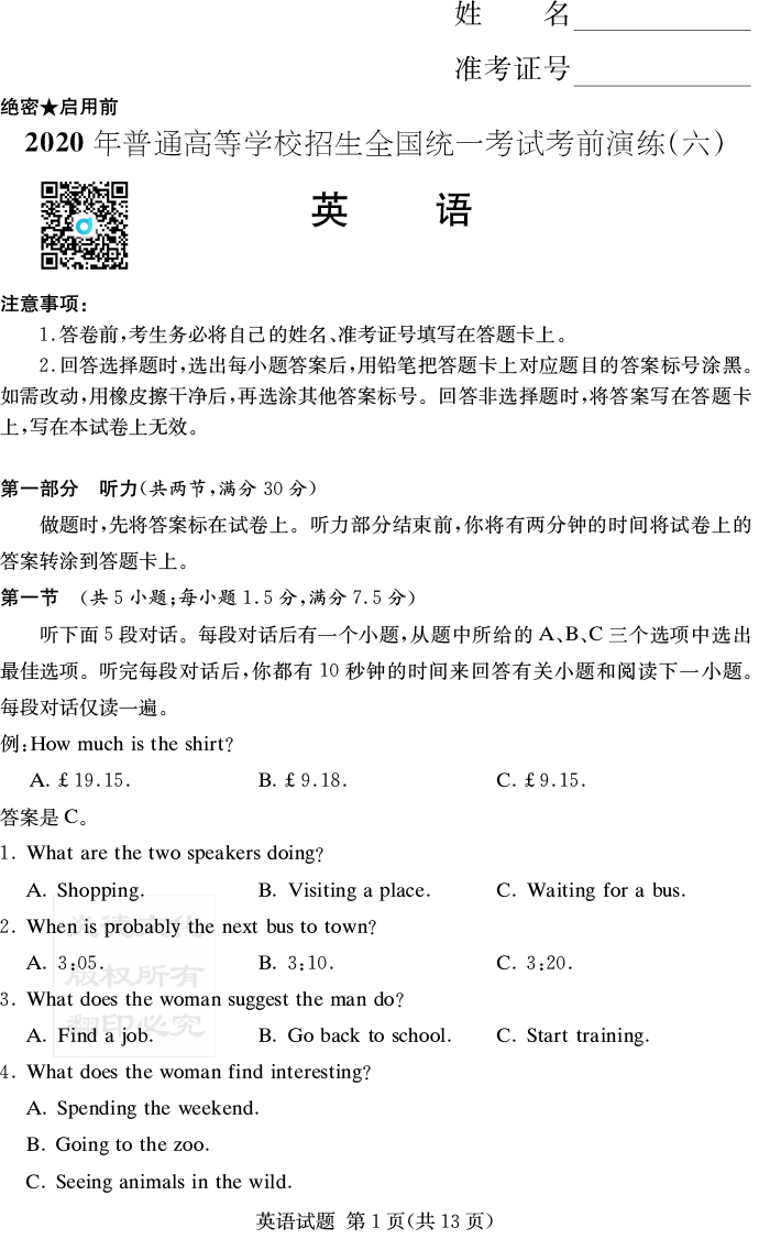 【英語】2020年普通高等學(xué)校招生全國統(tǒng)一考試考前演練(六)