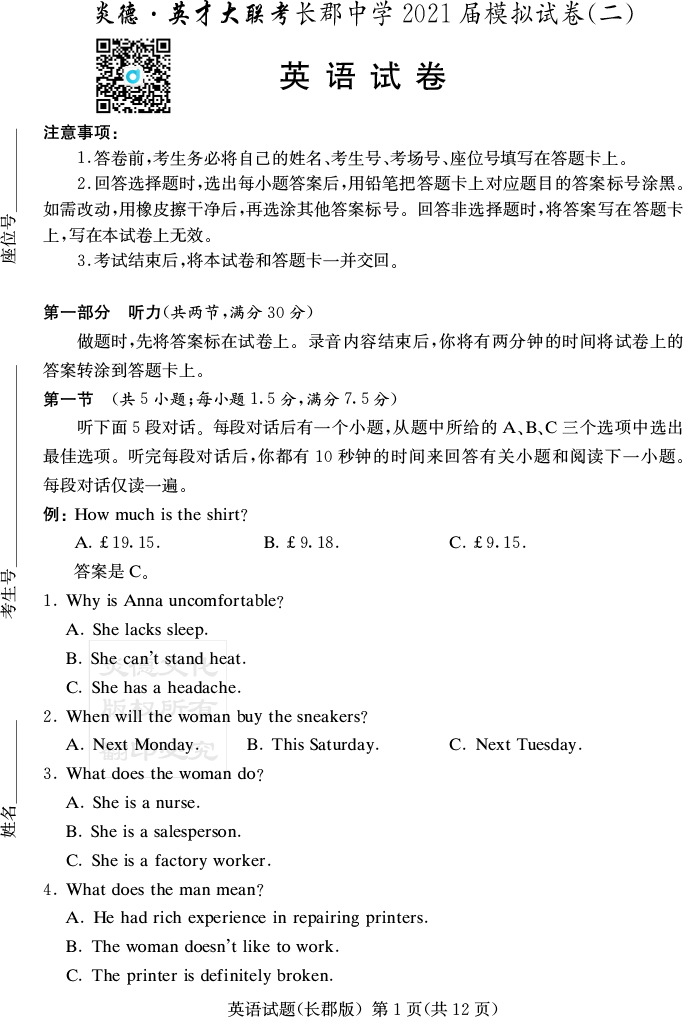 【英語】炎德英才大聯(lián)考2021屆長郡中學(xué)高三10次月考(模擬二)