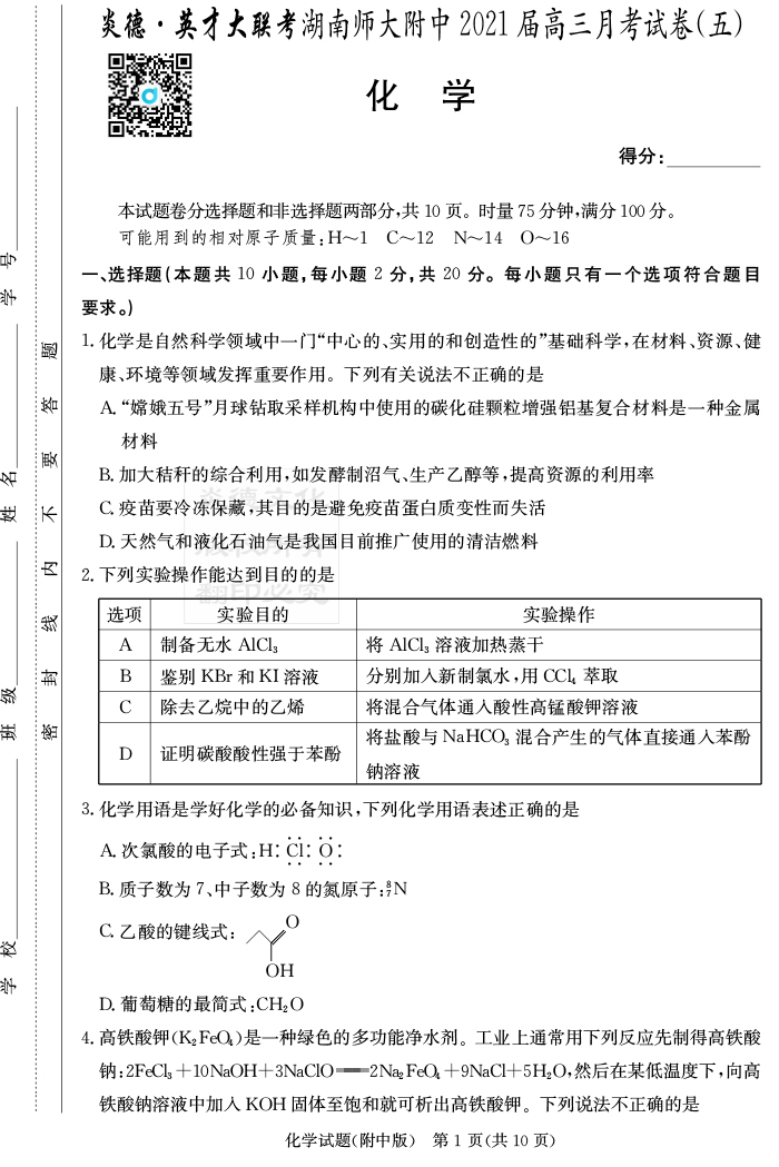 【化學(xué)】炎德英才大聯(lián)考2021屆湖南師大附中高三5次月考