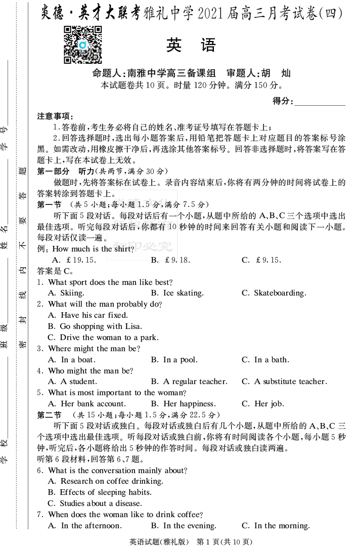 【英語】炎德英才大聯(lián)考2021屆雅禮中學(xué)高三4次月考