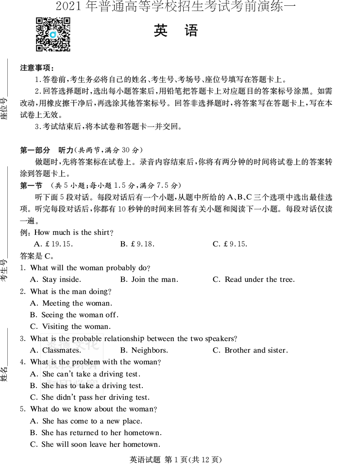 【英語】2021年普通高等學(xué)校招生全國統(tǒng)一考試考前演練(一)