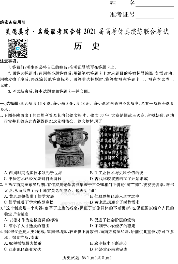 【歷史】2021年普通高等學(xué)校招生全國(guó)統(tǒng)一考試考前演練(五)