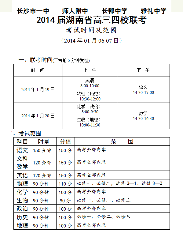 炎德英才大聯(lián)考2014屆湖南省高三四校聯(lián)考考試時(shí)間安排及范圍(2014.01.19-20)