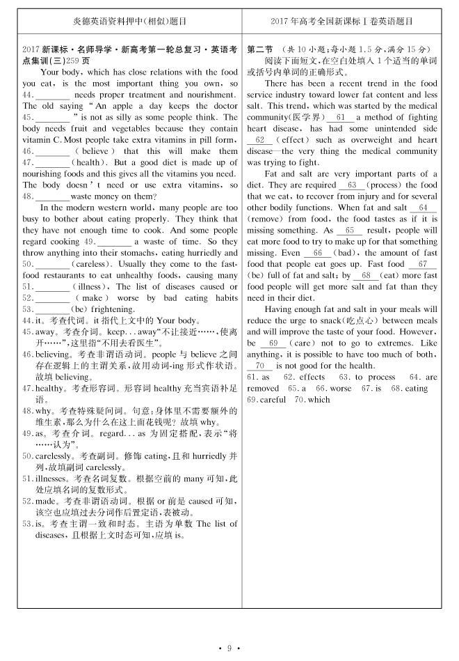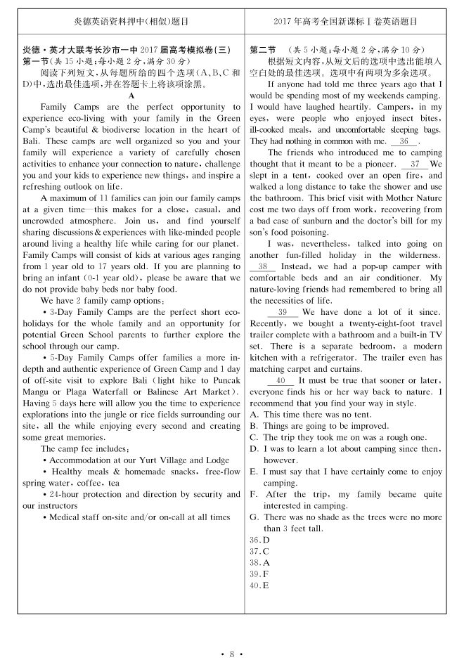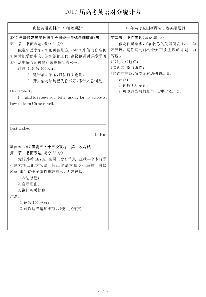 2017高考全國卷Ⅰ對(duì)分表-英語