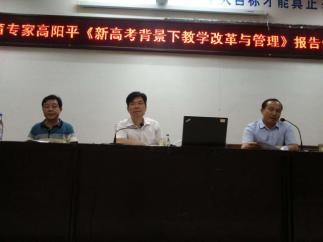 高陽平先生做《新高考背景下教學(xué)改革與管理》報告,并與該校領(lǐng)導(dǎo)、師生展開親切交流。高校長說,教育要“放眼未來,立足當(dāng)下”,要“以能力為主線,以問題為核心”,促進學(xué)生德、智、體、美全面發(fā)展,學(xué)校既要拿分,更要育人,要努力為國家、為社會培養(yǎng)有用之才。特別是高一、高二階段,更應(yīng)強調(diào)學(xué)生個性發(fā)展,注重素質(zhì)教育,同時輔以實例對我國當(dāng)代教育教學(xué)現(xiàn)狀及存在的問題進行了剖析。高校長淵博的學(xué)識和極富感染力的報告獲得了全場120余名教師的高度贊許和熱烈掌聲。