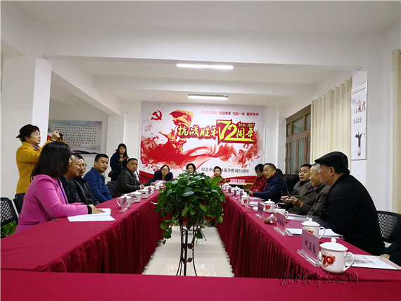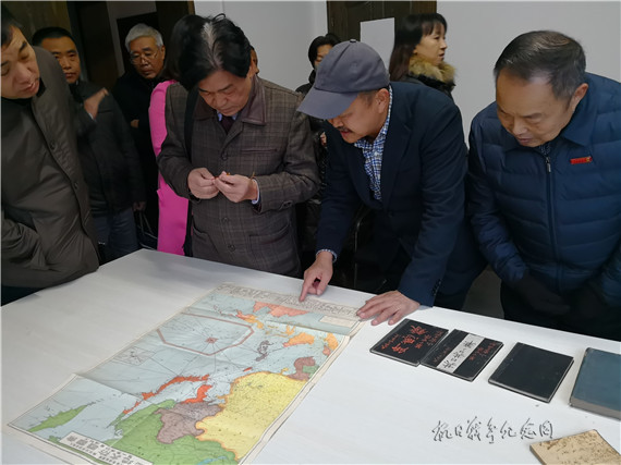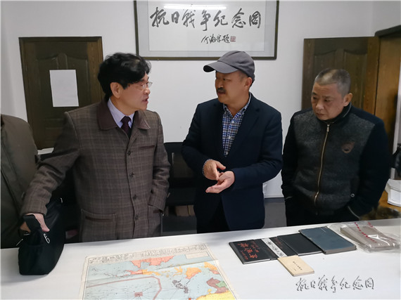 長沙市抗戰(zhàn)文化研究會(huì)會(huì)長、抗日戰(zhàn)爭(zhēng)紀(jì)念網(wǎng)主編、抗日戰(zhàn)爭(zhēng)圖書館館長何譽(yù)軍(右二)向長沙市關(guān)工委主任董學(xué)生(右三)等介紹抗日戰(zhàn)爭(zhēng)圖書館館藏資料