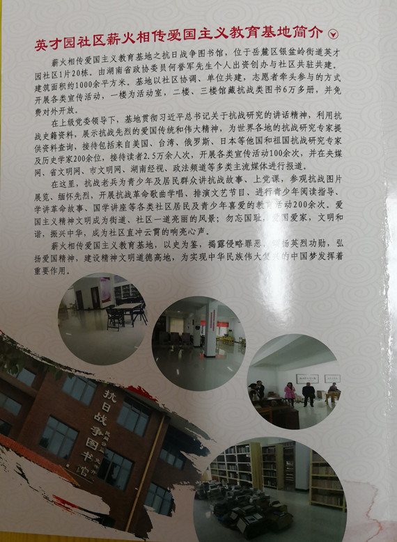 “薪火相傳”愛國主義教育基地由銀盆嶺街道英才園社區(qū)與湖南炎德文化實(shí)業(yè)有限公司于2017年共建。湖南炎德文化實(shí)業(yè)有限公司董事長、省政協(xié)委員何譽(yù)軍先生提供抗日戰(zhàn)爭(zhēng)圖書館圖書閱覽室及400佘平方米大廳作為青少年活動(dòng)基地,并將民間抗日戰(zhàn)爭(zhēng)圖書館免費(fèi)向社區(qū)居民開放。