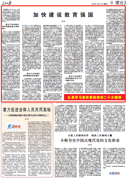 教育是國(guó)之大計(jì)、黨之大計(jì)。習(xí)近平總書(shū)記所作的黨的二十大報(bào)告首次將“實(shí)施科教興國(guó)戰(zhàn)略,強(qiáng)化現(xiàn)代化建設(shè)人才支撐”作為一個(gè)單獨(dú)部分,充分體現(xiàn)了教育的基礎(chǔ)性、戰(zhàn)略性地位和作用,并對(duì)“加快建設(shè)教育強(qiáng)國(guó)、科技強(qiáng)國(guó)、人才強(qiáng)國(guó)”作出全面而系統(tǒng)的部署,為到2035年建成教育強(qiáng)國(guó)指明了新的前進(jìn)方向。